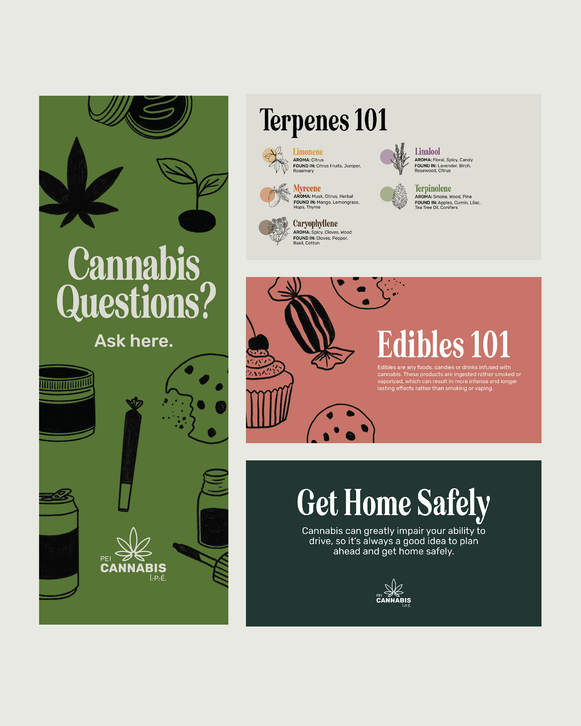 Refresh for PEI Cannabis' new and existing locations. Materials created include custom illustrations, in-store graphics, brochure and website graphics.